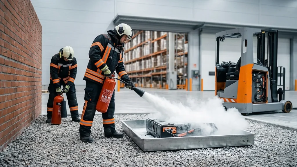 Extintores de Classe D são indicados quando há envolvimento de lítio metálico em quantidade relevante, porém não são a solução adequada para a maioria das baterias de íons de lítio encontradas em equipamentos de movimentação intralogística. Em alguns casos, se a extinção imediata não for possível, a estratégia é confinar o fogo e resfriar a área adjacente, permitindo que a bateria queime de forma controlada sem propagação.