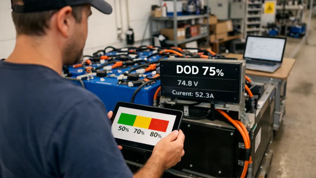 No entanto, mesmo com essa tecnologia, garantir a durabilidade máxima depende do monitoramento rigoroso da profundidade de descarga (DOD). A DOD, que representa a porcentagem da capacidade total da bateria utilizada antes da recarga, é um fator crucial que impacta diretamente o número de ciclos que a bateria suportará ao longo da sua vida útil. Para maximizar a longevidade, o ideal é manter a descarga o mais superficial possível (DOD baixo, como 50%). Contudo, para aplicações que exigem o uso da capacidade máxima, o limite de segurança e performance para as baterias Tianneng está tipicamente entre 70% e 80% de DOD. Este intervalo representa a máxima profundidade de descarga recomendada antes que a vida útil caia drasticamente.